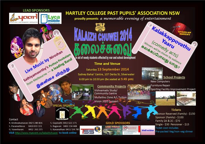 பருத்தித்துறை ஹாட்லிகல்லூரி பழைய மாணவர்களின் அனுசரணையுடன் அவுஸ்ரேலியாவின் சிட்னி நகரில் கலைச்சுவை நிகழ்வு எதிர்வரும் 13 ஆம் திகதி நடைபெறவுள்ளது.